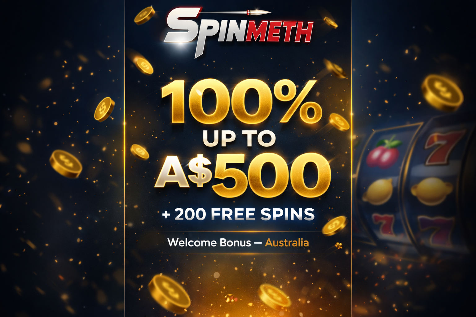 Register at Spinmeth, head to the cashier, enter the code into the 'Promo Code' field before you confirm the deposit. Deposit A$20 minimum. Bonus lands on your balance instantly. Total time under 2 minutes, including the typing.